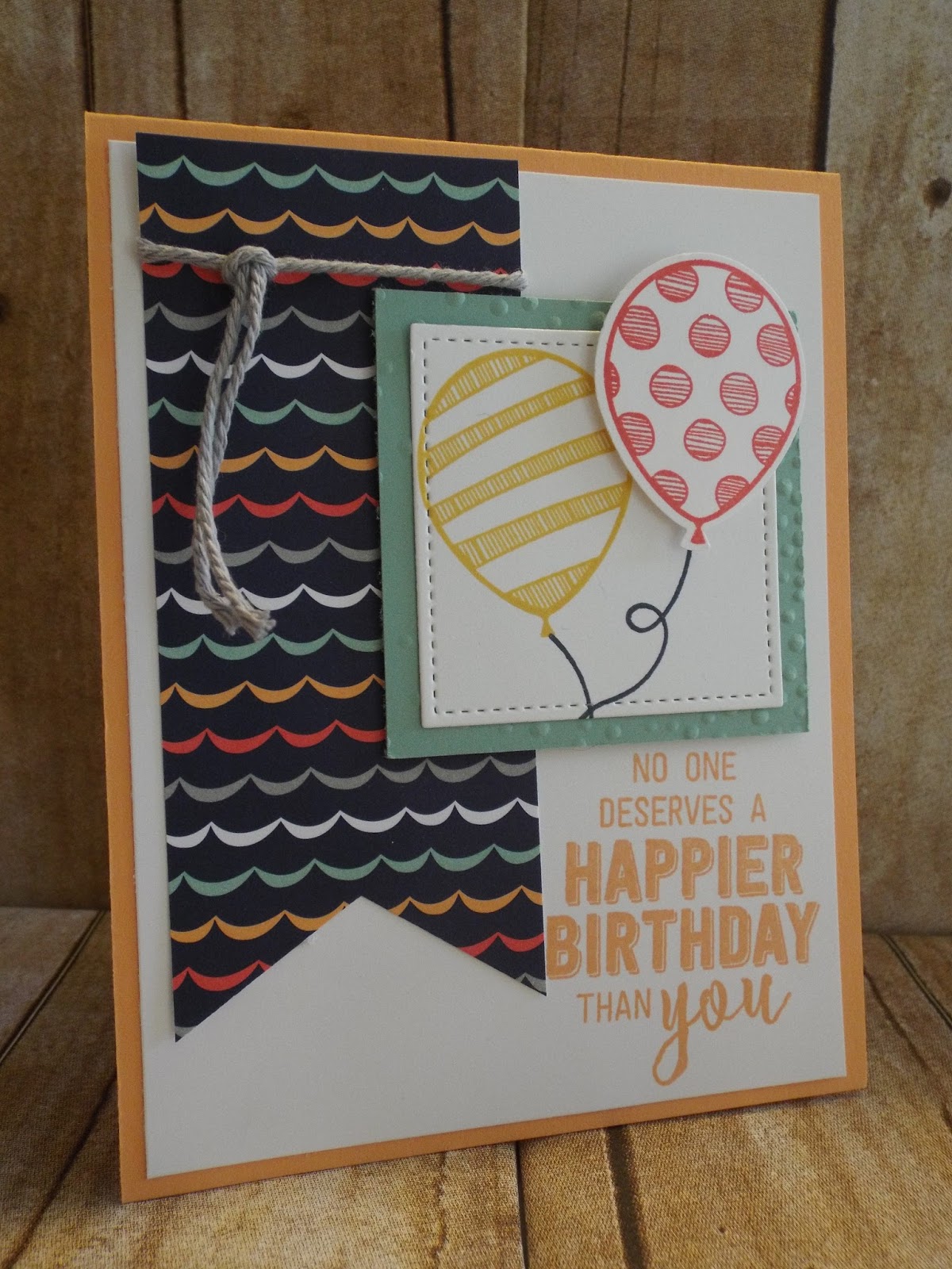 This one is done in Peekaboo Peach as the base of my card. I layered up a Whisper White with a banner of Up and Away DSP( I used the Triple Banner Punch for flagging the end). I wrapped a piece of Smokey Slate Thick Baker's Twine around it.